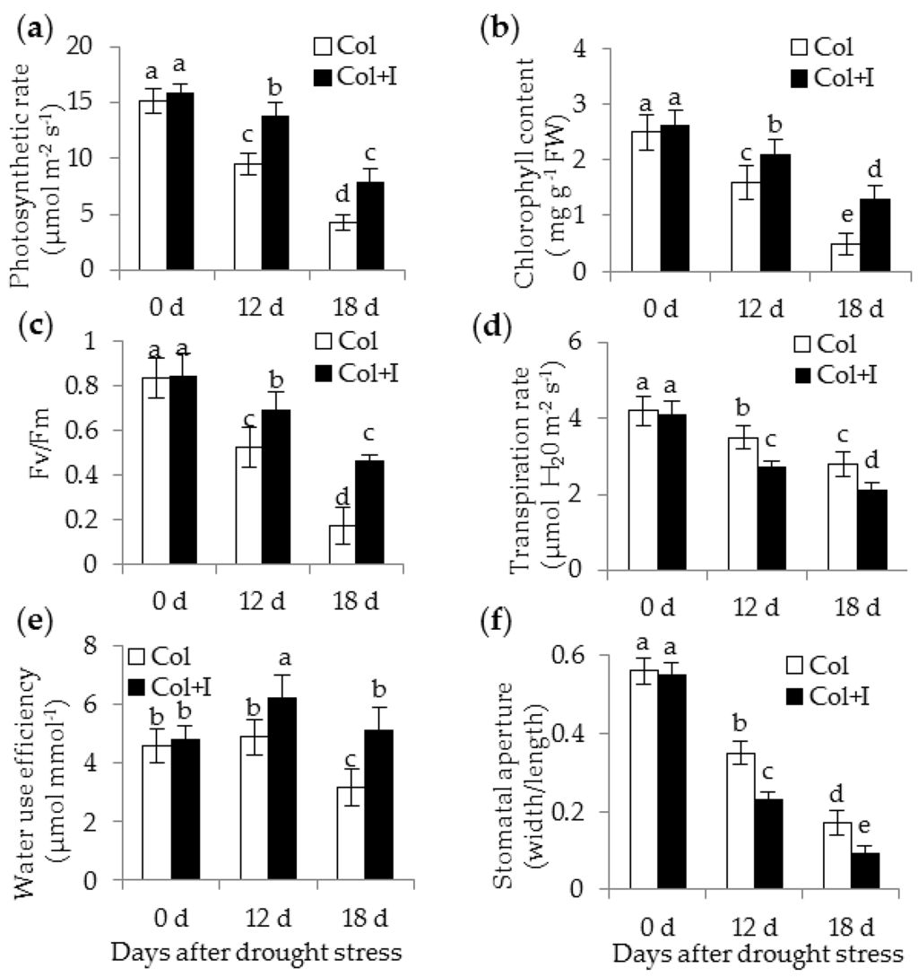 Stomatal density has been shown to influence photosynthetic traits and water use efficiency in plants [27]. In this study, several photosynthetic parameters were measured before and after drought treatments. The photosynthetic rates (Pn) of both the control and inoculated plants markedly dropped because of drought stress, but the value of Pn was considerably higher in the inoculated plants than in the control plants (Figure 6a). The chlorophyll content has been taken as a typical indicator that evaluates the ability of plants to tolerate abiotic stress [28]. Our data showed that the amount of chlorophyll displayed evident alterations with a gradual decrease accompanied by the time-delay of drought treatments (Figure 6b). The inoculated plants had higher chlorophyll content than the control plants after 12 or 18 d of water deprivation. Moreover, chlorophyll fluorescence was monitored in both the control and inoculated plants. The maximum photosystem II quantum ratio of variable to maximum fluorescence (Fv/Fm) in the control plants was notably lower than that in the inoculated plants (Figure 6c). Conversely, the control plants exhibited higher transpiration rates than the inoculated plants (Figure 6d), which contributed to higher water use efficiency in the inoculated plants (Figure 6e). Furthermore, the stomatal behavior was examined. Under well-watered (WW) conditions, there was no significant difference in the stomatal aperture between the control and inoculated plants. The stomatal aperture of the inoculated plants was 26.4% and 25.9% lower than those of the control plants after 12 and 18 d of drought treatments, respectively (Figure 6f).
