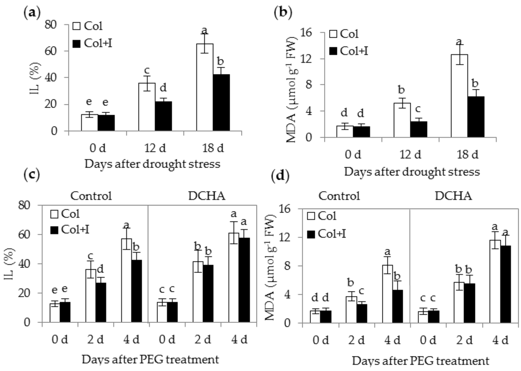 Reduced ROS levels in the inoculated plants suggested that BOFC15 possibly mitigated oxidative injury to cellular structure under DS conditions. To assess the extent of the physical damage to membrane structure, the values of ion leakage (IL) and malonaldehyde (MDA) were determined in both the control and inoculated plants. The control plants had higher values of IL and MDA than the inoculated plants under DS conditions, whereas no apparent difference was observed between the control and inoculated plants grown under WW conditions (Figure 8a,b). Similarly, the inoculated plants displayed lower values of IL and MDA than the control plants when plants were grown under PEG-induced stress conditions, but no notable difference was observed between the control and inoculated plants in the presence of 1 mM DCHA (Figure 8c,d).