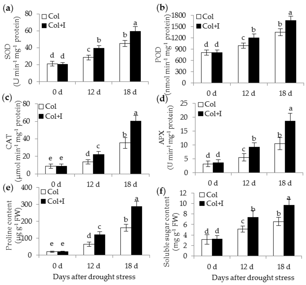 Inoculation with BOFC15 enhanced antioxidant enzymatic activities, and osmotic substances (proline and soluble sugar) in the Arabidopsis plants under drought stress. 22-day-old plants were subjected to water deprivation for 12 and 18 d, respectively. SOD (a); POD (b); CAT (c); APX (d); proline (e); and soluble sugar (f) were examined in both the control (Col) and inoculated plants (Col + I); different lowercase letters above the bars represent significant difference at p < 0.05.