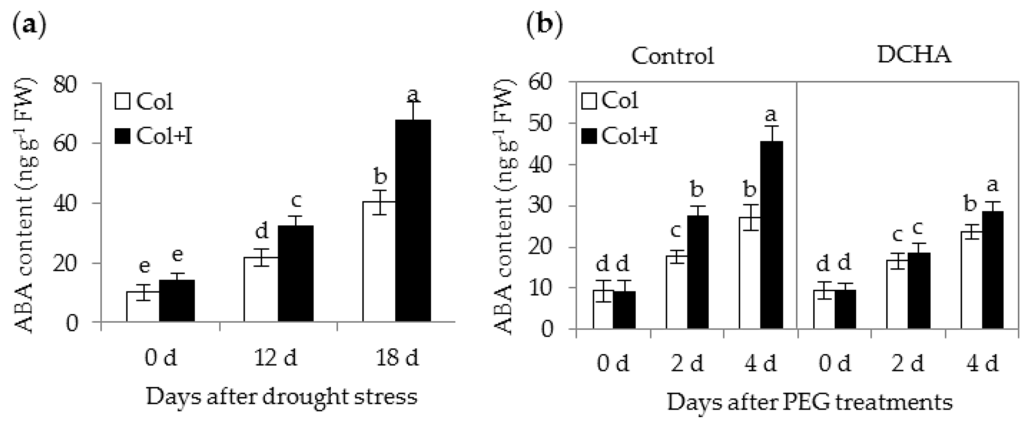 Inoculation with BOFC15 affected the ABA content in host plants under drought or PEG-treated stress conditions. (a) The ABA content was determined in leaves from both the control and inoculated plants grown under WW and DS for 12 or 18 d, respectively. Additionally, 12-day-old Arabidopsis seedling grown on MS medium containing 10% PEG6000 was inoculated with BOFC15; After 2 or 4 d of PEG6000 treatments, (b) the ABA content was quantified in both the control (Col) and inoculated plants (Col + I); different lowercase letters above the bars represent significant difference at p < 0.05.