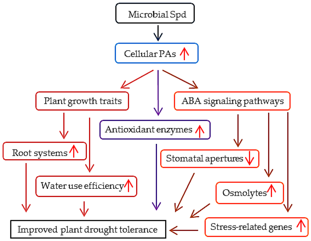 In addition to the transgenic regulation of PAs synthesis, exogenous PAs also improve abiotic stress tolerance in plants. Spraying of Put in wheat improves drought resistance with increased photosynthetic traits, promotes osmolyte accumulation, and reduces membrane damage compared with the control plants [16]. Additionally, exogenous Spd induces the tolerance of Panax ginseng seedlings to high salinity by activating antioxidant enzymatic activities [17]. Interestingly, cellular PA levels have been found to influence the biosynthetic pathways of ABA. The application of Spd, Spm, and Put remarkably elevated the ABA content in the wheat grains under drought stress [18]. Exogenous Put promoted the ABA synthesis and enhanced drought tolerance of Lotus tenuis plants [19]. These studies have shown that PAs can adjust plant stress responses via the ABA-mediated signaling pathways. In view of the physiological functions of PAs, the biosynthesis of PAs has been genetically manipulated to enhance plant drought tolerance. However, transgenic plants must be subjected to rigorous food and environmental safety trials [20]. Moreover, almost all experiments on exogenous PA application were confined within the laboratory and small field regions because of the cost of PAs [16,17,18,19]. Thus, developing efficient ways to improve plant adaptation to drought stress has become an urgent concern.