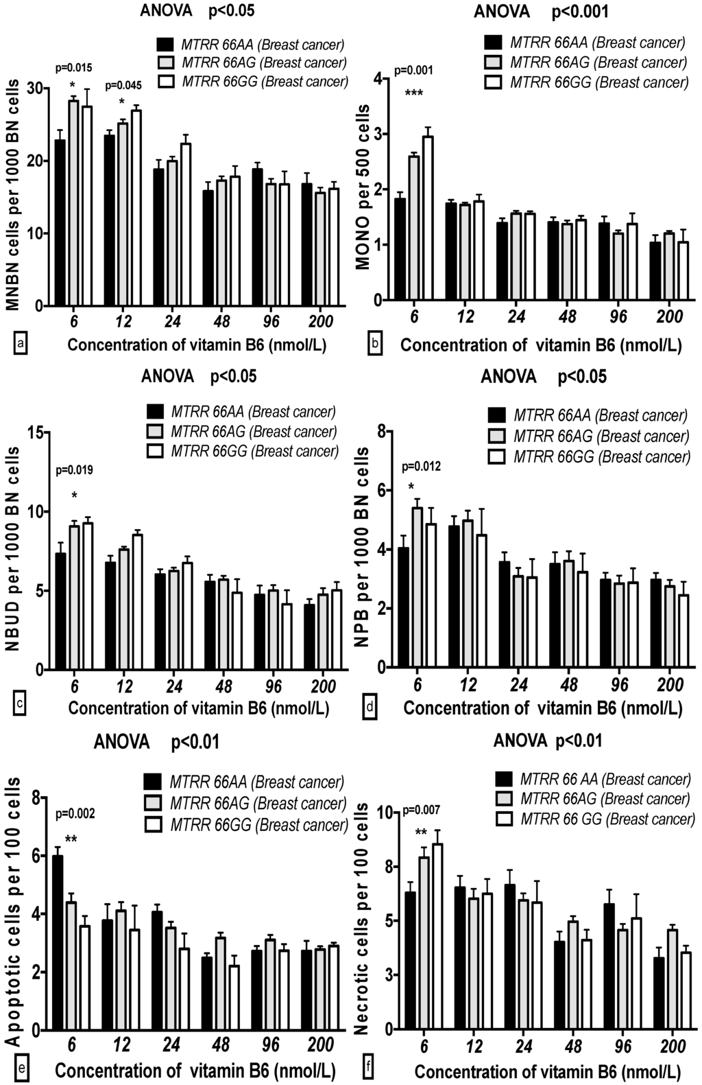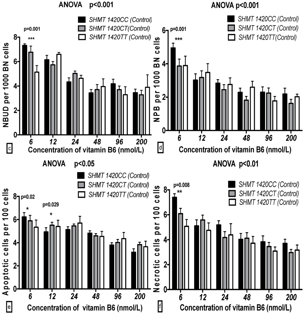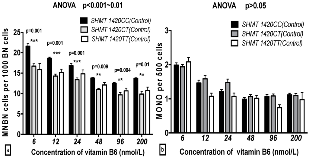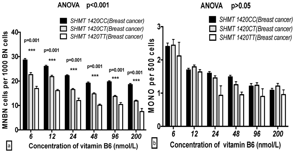 2.5. The GSACV Indexes in Different SHMT C1420T, MS A2756G, and MTRR A66G Genotypes in Breast Cancer Cases and Controls at Various B6 Concentrations