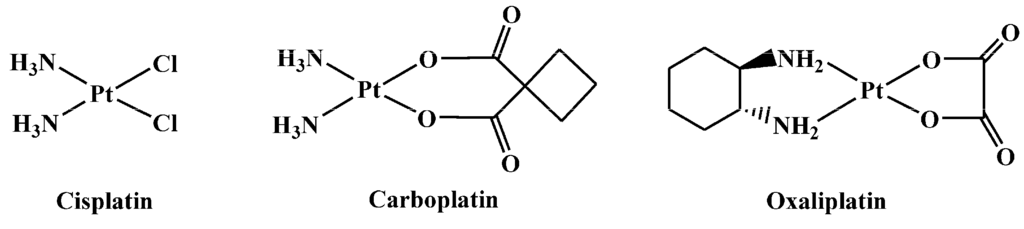 The third generation platinum drug oxaliplatin—trans-1R,2R-diaminocyclohexane(oxalato)platinum(II)—contains the diaminocyclohexane (1R,2R-DACH) chelating ligand and received worldwide approval for the treatment of colorectal cancer [7]. Although oxaliplatin produces the same type of lesions on DNA as cisplatin, its spectrum of activity is different from that of the first-generation drug and also the occurrence of resistance to oxaliplatin is different from that of cisplatin and carboplatin. The mechanism of action responsible for the different activity of oxaliplatin, with respect to cisplatin, has not yet been completely understood. However, it has been demonstrated that the non-leaving diamine has a fundamental role in the recognition of {(DACH)Pt}-DNA adducts by DNA-repair proteins. These adducts, in turn, could contribute to the absence of cross-resistance with the other two Pt-drugs cisplatin and carboplatin [8]. Neurotoxicity is the major dose-limiting feature associated with the use of oxaliplatin [9].