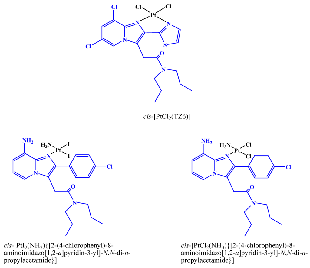 Pursuing our interest for tissue-specific targeting of metal complexes, in recent papers we have synthesized platinum(II) compounds with ligands specific for TSPO, such as 2-[6,8-dichloro-2-(1,3-thiazol-2-yl)H-imidazo-[1,2-a]pyridin-3-yl]-N,N-dipropylacetamide (TZ6). The resulting cisplatin-like compound, cis-[PtCl2(TZ6)] (Figure 2), has been shown to possess affinity and selectivity for the TSPO comparable to those of TZ6. In solvents with low dielectric constants, we also observed the formation of a dimeric aggregate formed through non-covalent intermolecular interactions of the planar aromatic cycles of the ligands. This finding further supports the potential intercalating ability of cis-[PtCl2(TZ6)] toward DNA [27]. The poor aqueous solubility of cis-[PtCl2(TZ6)], which is typical of platinum(II) complexes with bidentate aromatic ligands [28], compelled us to pursue the synthesis of Pt compounds with TSPO ligands endowed with enhanced water solubility. To this end, in a subsequent work we synthesized two new Pt compounds structurally analogous to picoplatin and differing for the anionic ligands, cis-[PtI2(NH3){[2-(4-chlorophenyl)-8-aminoimidazo[1,2-a]pyridin-3-yl]-N,N-di-n-propylacetamide}] and cis-[PtCl2(NH3){[2-(4-chlorophenyl)-8-aminoimidazo[1,2-a]pyridin-3-yl]-N,N-di-n-propylacetamide}] (Figure 2) [29]. Both complexes contained the imidazopyridinic ligand [2-(4-chlorophenyl)-8-aminoimidazo-[1,2-a]pyridin-3-yl]-N,N-di-n-propylacetamide and were endowed with high affinity and selectivity for TSPO [30].