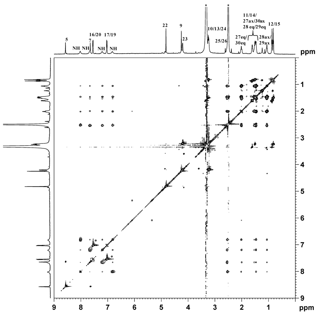 1H (top and left) and TOCSY 2D (center) NMR spectra (600 MHz, 1H) of 3 in DMSO-d6. The asterisks indicate residual solvent peaks.