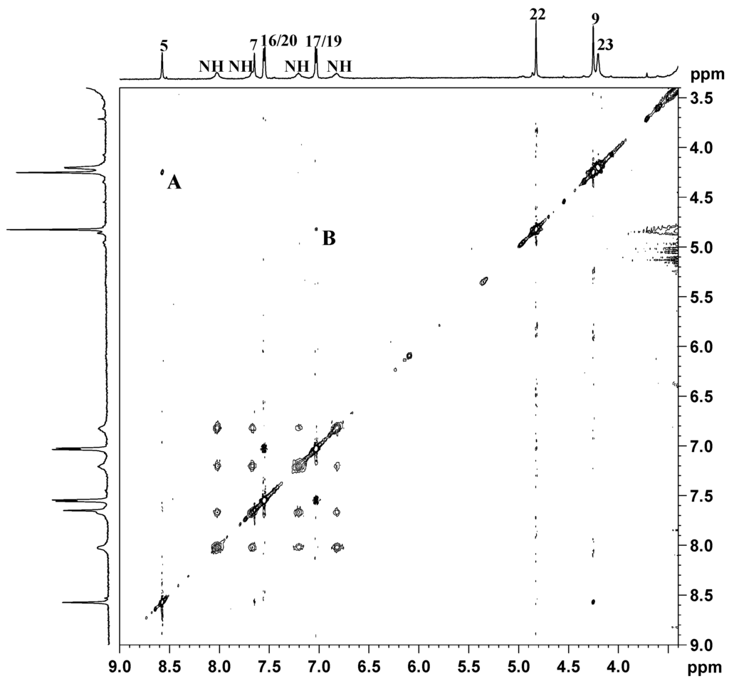 Portion of 1H (top and left) and NOESY 2D (center) NMR spectra (600 MHz, 1H) of 3 in DMSO-d6.