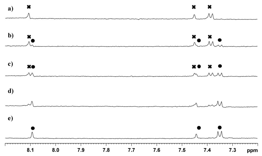 in Figure 8a). After 8 h of incubation we observed a decrease in intensity of the peaks of 3 and the concomitant increase of a new set of peaks, marked with ● in Figure 8b (H5, 8.09 ppm; H7, 7.44 ppm; H16/20 7.35 ppm), that was assigned to compound 2 by comparison with a spectrum of the TSPO ligand recorded in similar conditions. This new set of signals indicates that hydrolysis of the ester bond linking 2 to the ethanolato linker occurs in physiological-like conditions. The spectra recorded at 24, and 56 h showed a further decrease of the signals of 3, which disappeared completely after 108 h. The half-life of the complex, as calculated from the NMR experiment, was determined to be approximately 24 h.