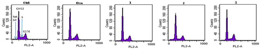 The capability of the new compounds 1 and 3 to perturb the cell cycle progression of LoVo cells at their IC50 concentrations was investigated by FCM analysis and compared to that of oxaliplatin and of the TSPO ligand 2 (Figure 9). After 24 h treatment with the test compounds, cells exhibited only a slight modification of the cell cycle distribution. As expected, oxaliplatin delayed the S-phase and started to accumulate cells in G2/M-phase and G0/G1 phase [48]. Compounds 3 and 1 induced no notable changes compared to oxaliplatin. The TSPO ligand 2 induced a sub-G0/G1 cell population after 24 h, consistent with the formation of apoptotic cells as previously demonstrated for this class of compounds [30].