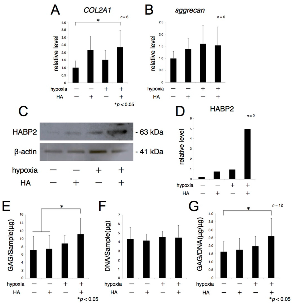 Exogenous high molecular weight HA has been reported to promote GAG synthesis in chondrocytes under normoxic conditions [,]. Exogenous high molecular weight HA can infiltrate articular cartilage in normal individuals and patients with OA, binding to HA receptors expressed on the chondrocyte surface []. Compared with normoxia, hypoxia has been reported to increase the synthesis of GAG and type II collagen synthesis in articular chondrocytes [] and to simultaneously inhibit matrix-degrading enzymes, such as MMP-13 []. We also previously reported that hypoxia enhanced the expression of proteoglycan and type II collagen genes in chondrocytes []. In addition, culture of human normal and OA chondrocytes cultured under hypoxic conditions was found to increase the expression of HAS2 []. Although exogenous high molecular weight HA and hypoxia have been individually reported to enhance cartilage matrix metabolism, their combined effects had not been determined. In this study, articular cartilage explants were cultured under hypoxic conditions in the presence of exogenous HA to examine their effects on the synthetic ability of hyaline cartilagenous ECM. The amount of GAG and the expression of COL2A1 mRNA was significantly higher in explants cultured under hypoxic conditions in the presence of HA than under normoxic conditions in the absence of HA. The expression of aggrecan mRNA and the protein production of HABP2 which is an ECM protein was also increased. These findings suggested that ECM production was greater in the presence of both exogenous high molecular weight HA and hypoxia than either alone, and support our original hypothesis stated in the introduction. Normal articular chondrocytes survive physiologically under hypoxic conditions and OA chondrocytes are also exposed to a greater degree of hypoxia. These findings also indicated that hypoxic environments may play an important role in potentiation of ECM synthesis stimulated by exogenous high-molecular weight HA in vivo.