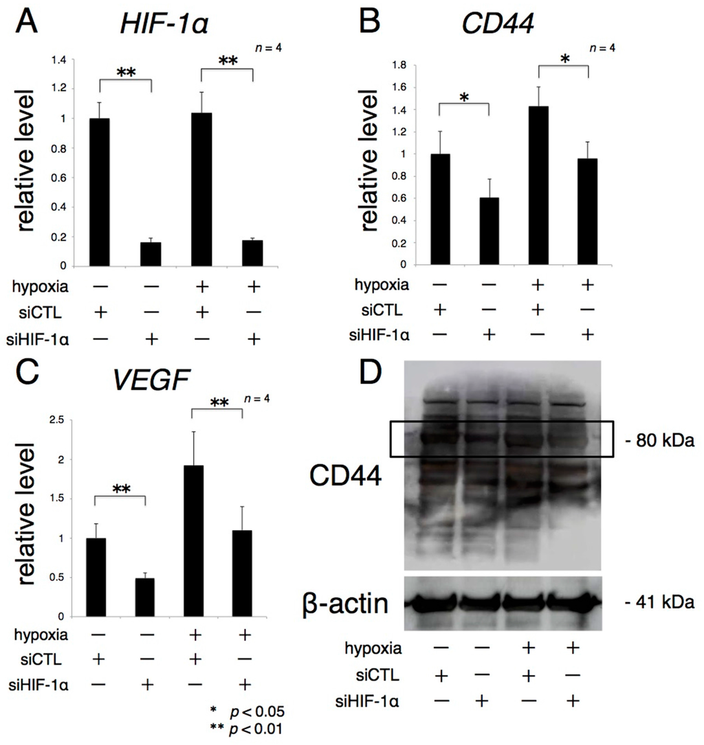More than 80% of the knockdown effect due to siHIF-1α on rACs persisted for 84 h after transfection under both normoxic and hypoxic conditions (Figure 5A). CD44 and VEGF mRNA expression, which were increased by hypoxia, were significantly reduced by transfection of siHIF-1α (Figure 5B,C). Similarly, CD44 protein expression was inhibited by transfection of siHIF-1α focusing on the bands around 80 kDa: predicted molecular weight of CD44 (Figure 5D, black lined frame). The intensity of the other bands considered to be possible isoforms was also decreased by transfection of siHIF-1α [].