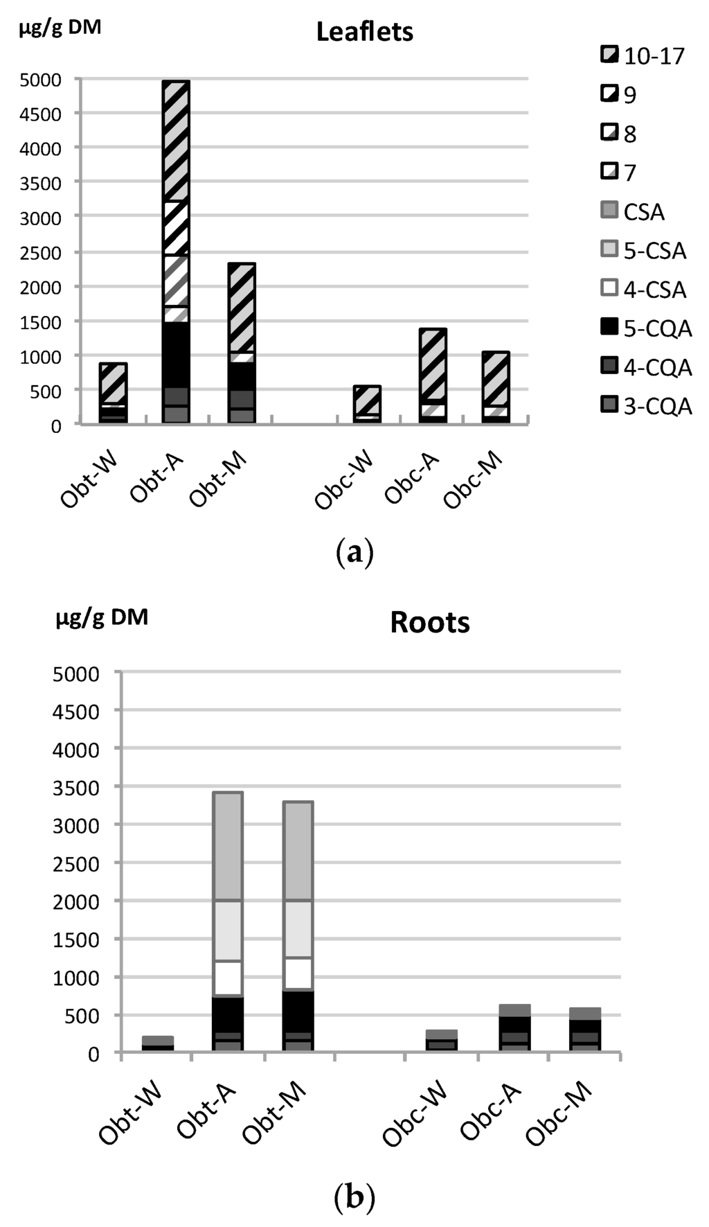 2.5.1. Characterization of Caffeoylquinic Derivatives (Mr = 354) in Root and Leaflet Extracts