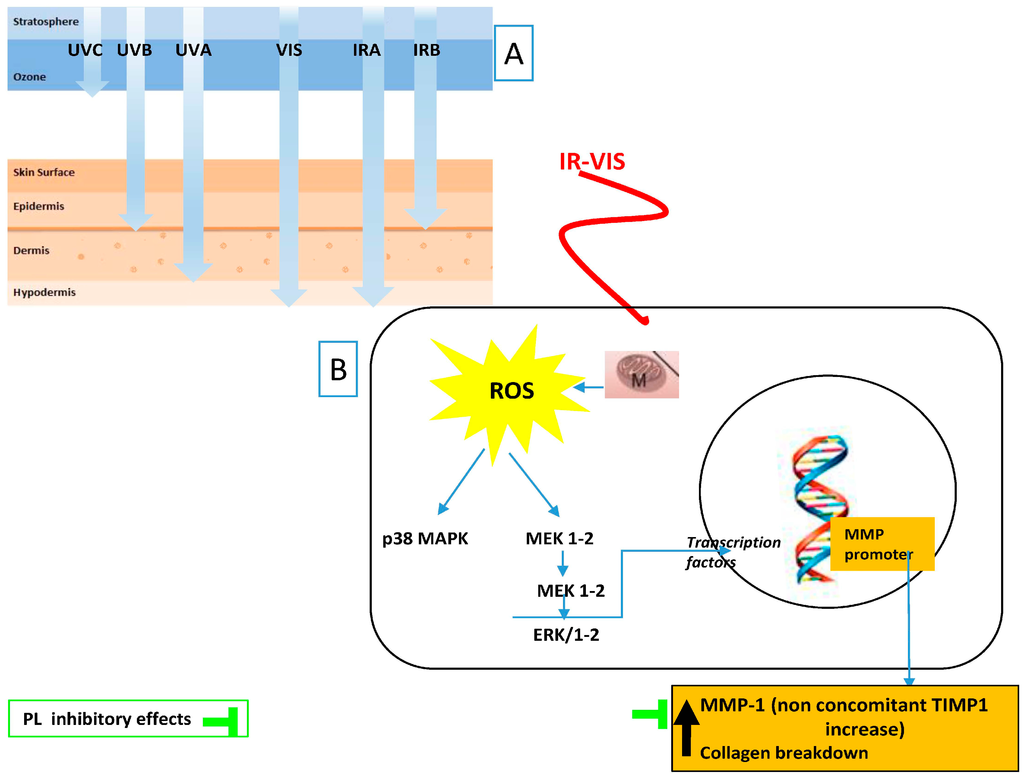 Tested anti IR–VIS effects of Polypodium leucotomos (PL) extract: (A) ultraviolet radiation (UV), visible light (VIS), and infrared radiation (IR) depth penetration in the skin; and (B) main PL effects reflect its capacity to decrease MMP-1 upregulation induced by cutaneous exposure to IR–VIS. Black arrows indicate increased/decreased effects due to IR–VIS.