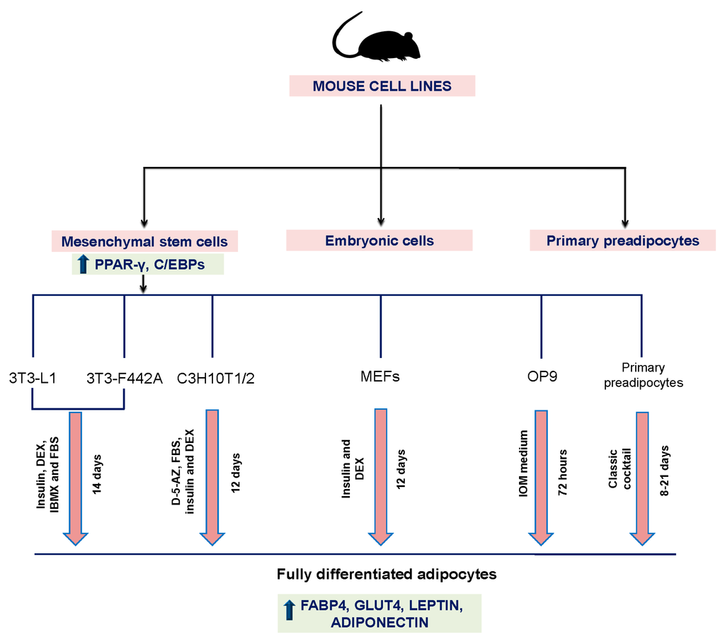 Primary mouse embryonic fibroblasts (MEFs) are derived from totipotent cells of early mouse mammalian embryos and are capable of differentiating into adipocytes with variable efficiency (usually 10%–70%), whereas most immortalized MEF lines do not differentiate unless a pro-adipogenic transcription factor such as PPAR-γ or C/EBPα is introduced [69]. MEFs present a number of properties that make them an attractive cell culture model. These cells are easy to establish and maintain, proliferate rapidly, and large numbers of cells can be produced from a single embryo within several days following explantation. Moreover, MEFs can be expanded through several passages. Similar to the primary cultures, MEFs have certain limitations as a consequence of their origin. Therefore, because of the cellular heterogeneity of embryonic tissue, the culture of these cells is often difficult, although steps can be taken to ensure a greater degree of homogeneity. Additionally, primary cultures of MEFs tend to reach senescence around passage 12 [28]. However, the adipogenesis of MEFs cells can be induced for eight days with a standard differentiation induction medium containing 0.5 mM IBMX, 1 µM DEX, 10 µg/mL insulin, 10 µM troglitazone, and 10% (v/v) FBS [27].
