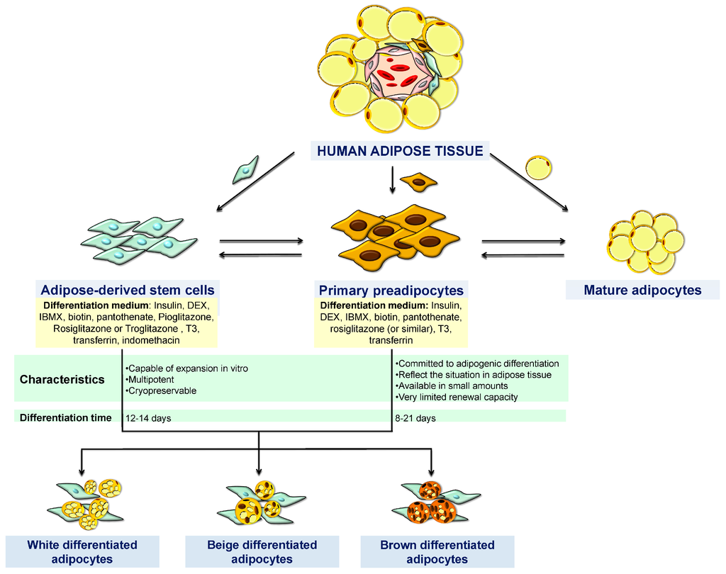 Since the 1970s, the differentiation of fibroblast cell lines into adipocytes has been extensively studied [1]. The ability to study this process in a tissue culture dish has enabled the exploration of general cellular mechanisms. In the last few years, different cell culture models and protocols have become available to study adipocyte biology [13,14,15] as revised by Armani et al. [16] and Poulos et al. [17]. Mature adipocytes, MSCs, and preadipocytes can be easily isolated from adipose tissue homogenates and used for research purposes. Moreover, adipocytes may alsobe allowed to dedifferentiate into lipid-free multipotent cells, referred to as dedifferentiated fat (DFAT) cells.