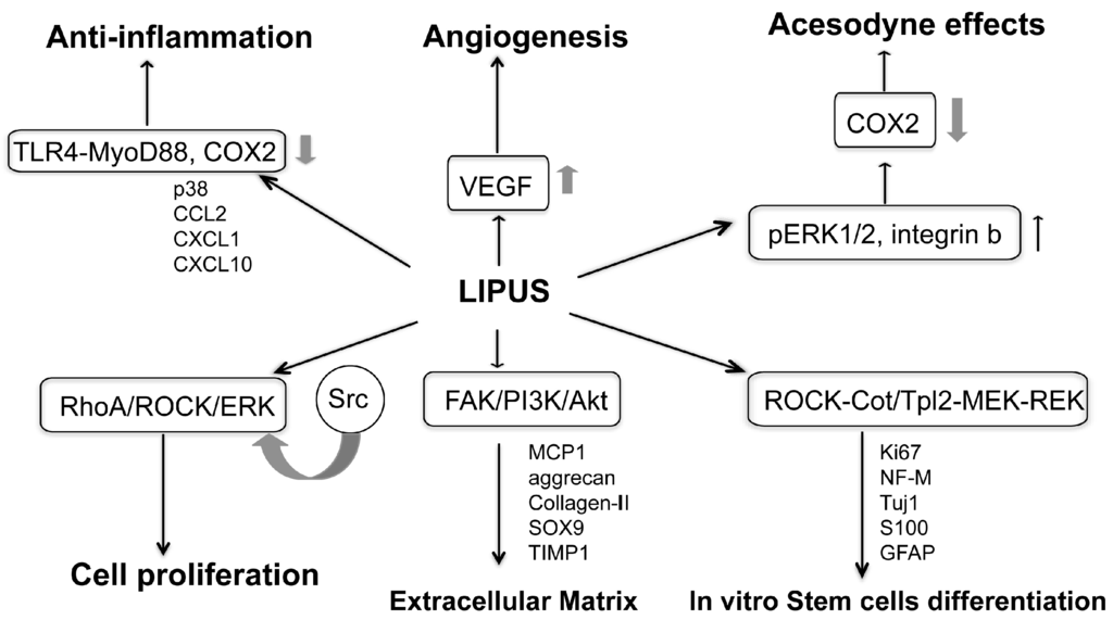 In 2004, by applying LIPUS to primary human foreskin fibroblasts, Zhou et al. investigated the effects of LIPUS at an intensity of 0.03 W/cm2 [24]. They noted that LIPUS activated Rho-associated coiled—coil-containing protein kinase (ROCK)-dependent pathway. Furthermore, daily LIPUS exposure resulted a two-fold increase in extracellular signal related kinase (ERK) 1/2 activation, as well as triggered cell proliferation. Actually, the RhoA/ROCK is an upstream regulator of the LIPUS-induced ERK pathway. LIPUS also triggered Src, which further regulates the ERK cascade.