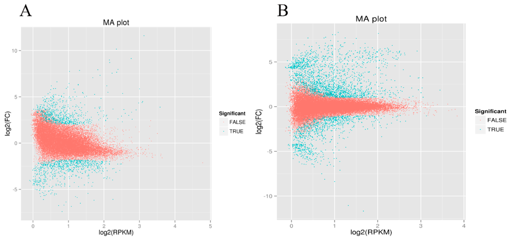 Differentially expressed genes in CMS vs. cytoplasmic male maintainer: (A) Whole-study overview of log-fold changes in gene expression in CMS vs. cytoplasmic male maintainer in May 2013; (B) Whole-study overview of log-fold changes in gene expression in CMS vs. cytoplasmic male maintainer in May 2014. The x-axis indicates the absolute expression levels (log2 RPKM (Reads Per Kilobase per Million mapped reads)). The y-axis indicates the log2-FC (fold changes) between the two samples. Genes for which differential expression is significant are shown as blue dots (Log2FC > 1 or < −1; FDR (False Discovery Rate) < 0.01).