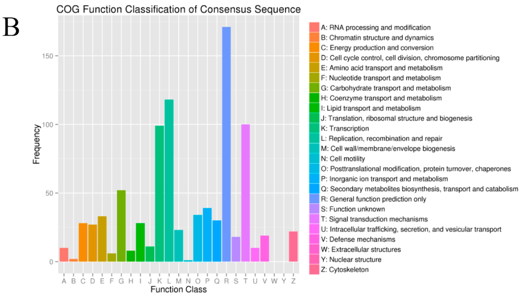 Cluster of Orthologous Groups (COG) categories of the unigenes: (A) sequencing data from May 2013; and (B) sequencing data from May 2014.