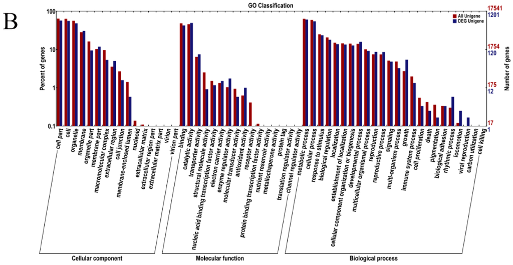 Gene Ontology Classification: (A) sequencing data from May 2013; and (B) sequencing data from May 2014. The unigenes are summarized into three main categories: cellular component, molecular function and biological process. The right side of the y-axis is the number of the genes; the left side of the y-axis is the percent of genes.