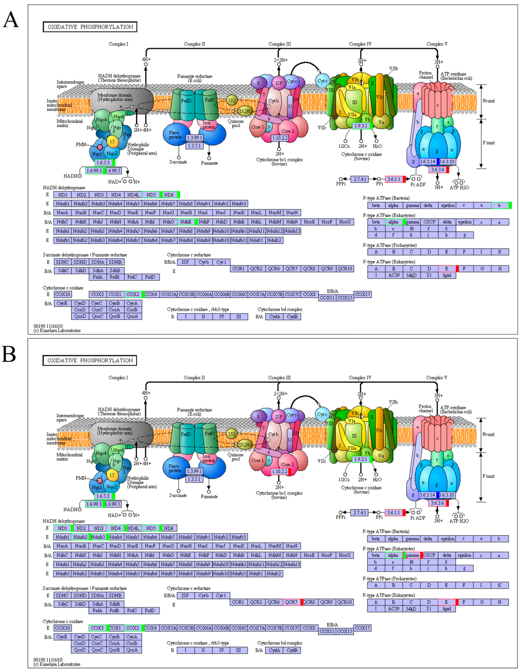 Welsh onion unigenes involved in oxidative phosphorylation pathways: (A) sequencing data from May 2013; and (B) sequencing data from May 2014. Blue boxes: enzymes specific to this species; Green boxes: down-regulated genes; Red boxes: up-regulated genes.