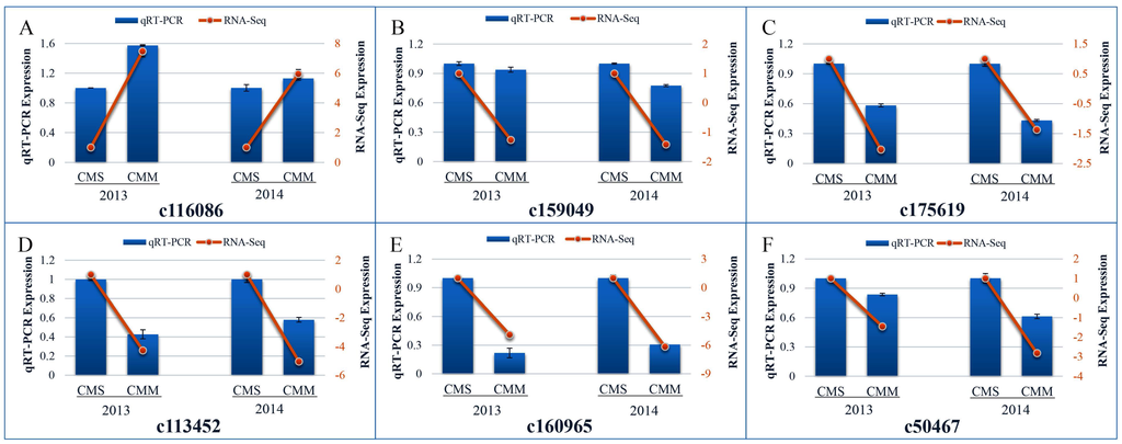 RT-qPCR and RNA-seq verification of differentially expressed candidate unigenes. CMS: Cytoplasmic male sterility; CMM: Cytoplasmic male maintainer. Data represent the average of three independent experiments. Error bars indicate the standard deviation (STDEV) for three biological replicates and three technical replicates in each experiment. (A–F) Different unigene IDs: (A) c116086; (B) c159049; (C) c175619; (D) c113452; (E) c160965; and (F) c50467.