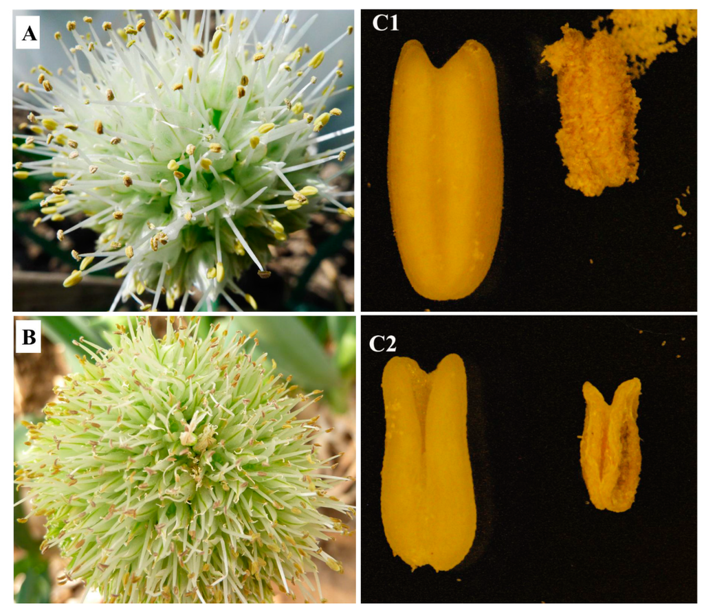- Nishimura, J.; Shino, M. Studies on the male sterility in Welsh onion. Jpn. Soc. Hortic. Sci. 1972, 9, 180–181. [Google Scholar]