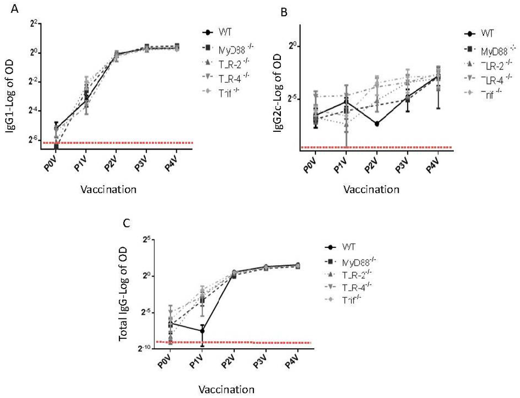 TLR signaling is dispensable for V. cholerae-specific antibody production following oral immunization with Dukoral vaccine. TLR mutant mice and WT controls (n = 5 mice per group) were orally immunized on days 0, 10, 20, and 30, with 3 × 109 V. cholerae and 10 µg CTB. Serum was collected 9 days after each vaccination and V. cholerae-specific antibody titer against A, IgG1, B, IgG2a, and C, IgG-Fc was measured by ELISA. The plates were coated with 50 μL of 12 × 106 V. cholerae/mL. The next day, coating buffer was decanted and plates were washed once in PBS. Plates were then blocked for 2 h at 37 °C with 2% FCS-PBS. After blocking, plates were washed once in PBS and diluted samples were added to duplicate wells. After incubating for 1 h at 37 °C, plates were washed with PBS and then incubated for 1 h at 37 °C with 50 μL of secondary horseradish peroxidase (HRP)-conjugated secondary antibody in 2% FCS-PBS (goat anti-mouse A. IgG1, B. IgG2a, C. IgG-Fc). Plates were then washed and developed with 3,3′,5,5′-tetramethylbenzidine (TMB) one component HRP microwell substrate. The reaction was stopped by stop solution and plates were read on at 450 nm. The naïve control data are shown as dashed line. Results are shown as the mean log of O.D 450 nm ± SEM. P0V denotes pre-vaccination serum. P1V−P4V denotes post-1st vaccination through post-4th vaccination time points. The production of IgG, IgG1, and IgG2c was not statistically significant (p ≥ 0.05).