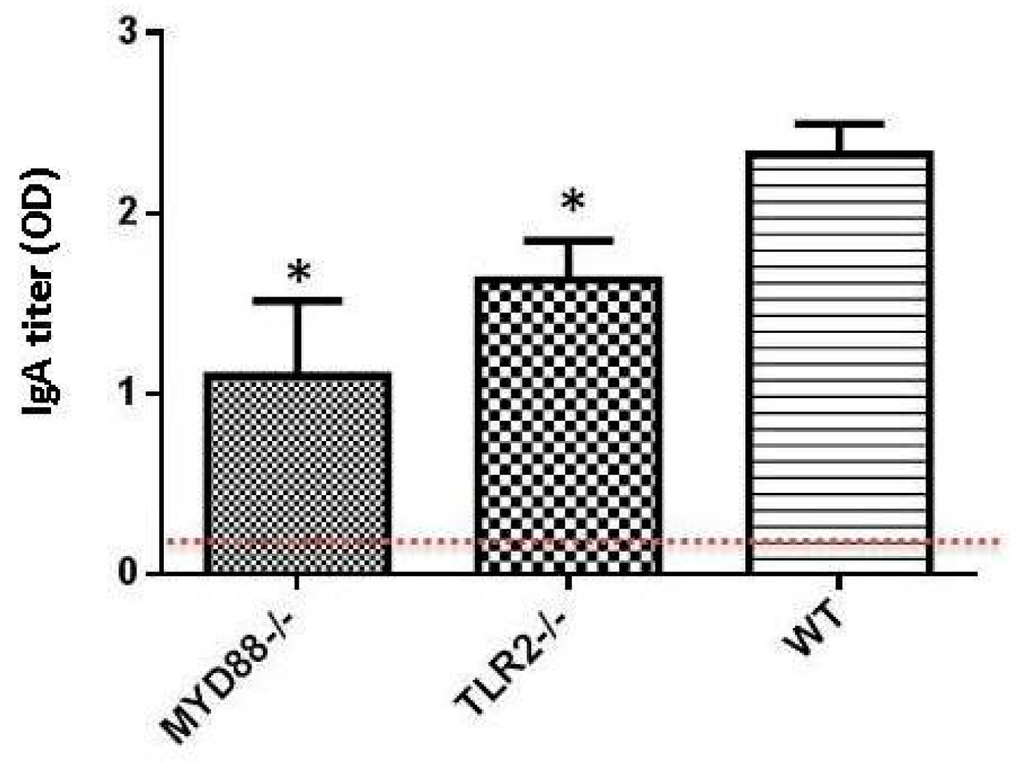 IgA is the predominant antibody on mucosal surfaces and is the primary line of protection against pathogens. Therefore, the requirement of TLR signaling for the generation of fecal antigen-specific IgA antibody was investigated. Fecal samples from orally immunized mice were collected and tested for the presence of vaccine antigen-specific IgA antibody responses. For measuring fecal IgA antibody responses, fecal pellets was processed and 50 μL of clarified fecal supernatant at an undiluted, 1:10, and 1:100 dilution was applied to antigen-coated plates. While none of the groups of TLR-deficient animals showed significantly impaired V. cholerae-specific fecal IgA antibody production (data not shown), MyD88−/− and TLR-2−/− mice were significantly impaired in their ability to produce CTB-specific fecal IgA (p = 0.02 and p = 0.03 respectively) (Figure 2). These results suggest that TLR signaling may be required for the generation of CTB-specific IgA but not V. cholerae-specific IgA antibodies.