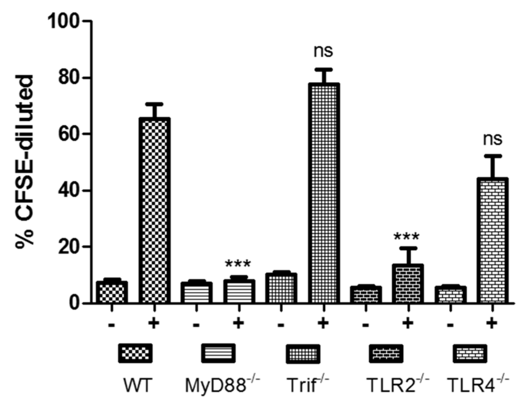 To evaluate CD4+ T-cell immune responses, spleens from immunized animals were collected 2 weeks after the last vaccination, labelled with 5 µM CFSE, stimulated with V. cholerae for 5 days, and proliferation was evaluated by flow cytometry by the degree of CFSE-dilution on fluorescently-labelled CD4+ T-cells. The results show that CD4+ T-cells from orally immunized TLR-2−/− (p = 0.0002) and MyD88−/− (p < 0.0001) mice were significantly inhibited in their ability to proliferate in response to stimulation with whole-cell V. cholera, compared to wild type control mice (Figure 3). Proliferation of CD4+ T-cells from TLR-4−/− mice was also decreased, but not significantly. No inhibition of proliferation was seen in CD4+ T-cells from Trif−/− mice, suggesting that CD4+ T cell proliferation in response to V. cholerae stimulation occurs independently of Trif signaling.