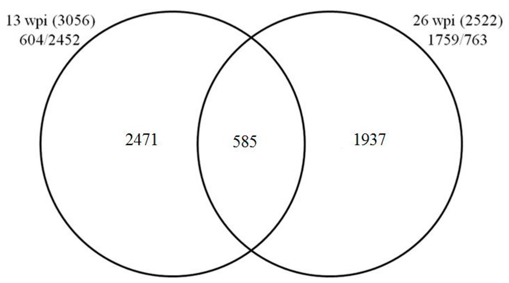In total, 3056 and 2522 DEGs with fold change ≥1.5 (p-value ≤ 0.005 and FDR (false discovery rate) ≤ 0.001) were identified to be regulated at 13 and 26 wpi, respectively. For the 3056 DEGs identified from samples at 13 wpi, 604 were upregulated whereas 2452 were downregulated (Table S1). For the 2522 DEGs identified from samples at 26 wpi (Table S2), 1759 were upregulated while 763 were downregulated. Only 585 DEGs were commonly identified from both time points (Figure 1 and Table S3).