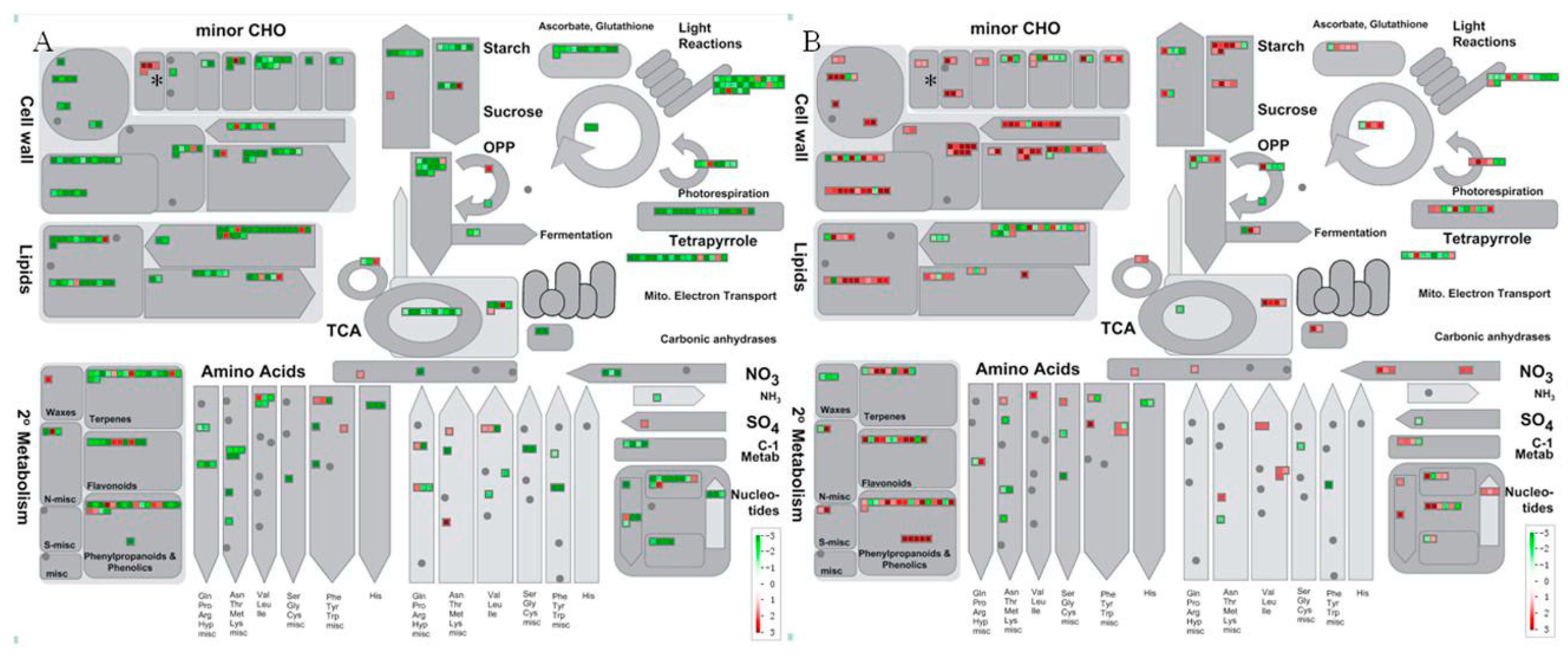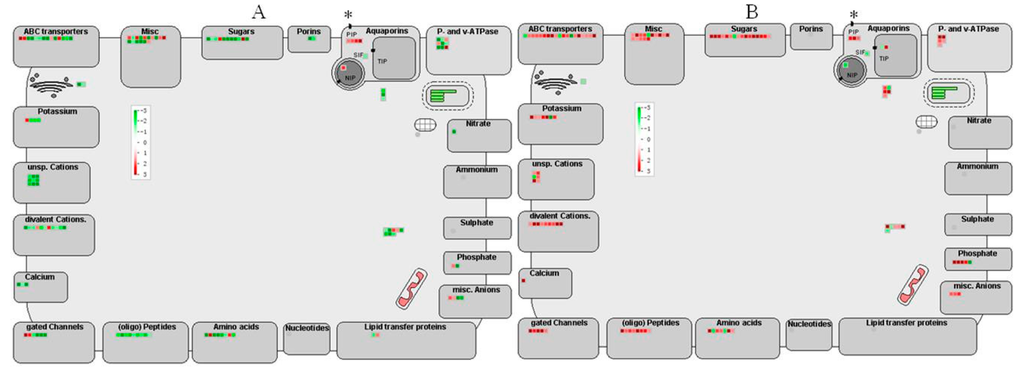 MapMan views of transport related genes that were differentially regulated after CLas infection at 13 (A) and 26 wpi (B). Genes significantly upregulated by CLas are displayed in red, and the downregulated are shown in green. * PIP (plasma membrane intrinsic protein) genes; SIP: small and basic intrinsic protein genes; NIP: Nod26-like intrinsic protein genes; TIP: tonoplast intrinsic protein genes; grid framed with ellipse represents chloroplast.