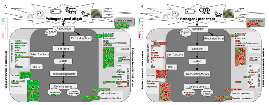 Stress related DEGs regulated by CLas infection at 13 wpi (A) and 26 wpi (B) respectively in ponkan leaves. Genes significantly upregulated by CLas infection are displayed in red, and those downregulated are shown in green. HSPs: heat-shock proteins; bZIP: basic leucin zipper; ERF: Ethylene response factor; MAPK: mitogen-activated protein kinase; MYB: MYB family transcription factor; DOF: DNA binding with one finger. ABA: abscisic acid; SA: salicylic acid; JA: jasmonic acid; R gene: resistance gene; Misc.: miscellaneous, PR-protein: pathogenesis-related protein, WRKY: WRKY transcription factors, DOF: DNA-binding with one finger.