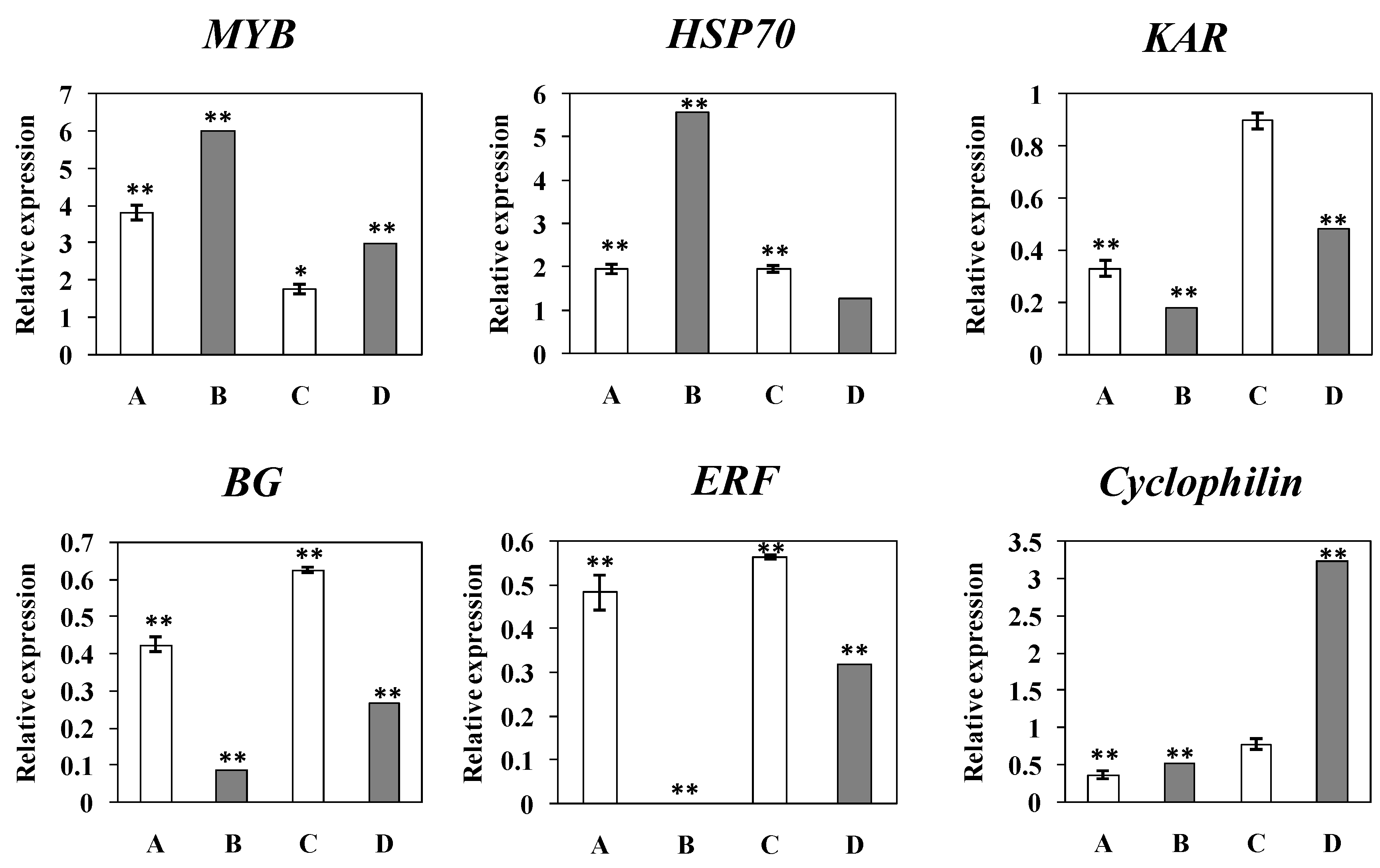 To validate the DGE data, quantitative Real Time PCR (qRT-PCR) was performed to investigate the transcriptional patterns of six representative genes as shown in Figure 5. The upregulated expression patterns of the MYB and HSP70 genes detected by qRT-PCR were in accordance with the DEG profile results. Similarly, the qRT-PCR detected downregulation in the expression of ERF, KAR, β-1,3-glucanase was also in accordance with the DGE profile results that showed the three genes were downregulated more significantly at 13 wpi than at 26 wpi. Cyclophilin was also found to be downregulated at 13 wpi by both qRT-PCR and DGE analysis, although it showed still a downregulation by qRT-PCR but an upregulation by DEG data at 26 wpi. Moreover, the temporal expression trends for all qRT-PCR verified genes were generally in agreement with those shown by DEG profiling data.