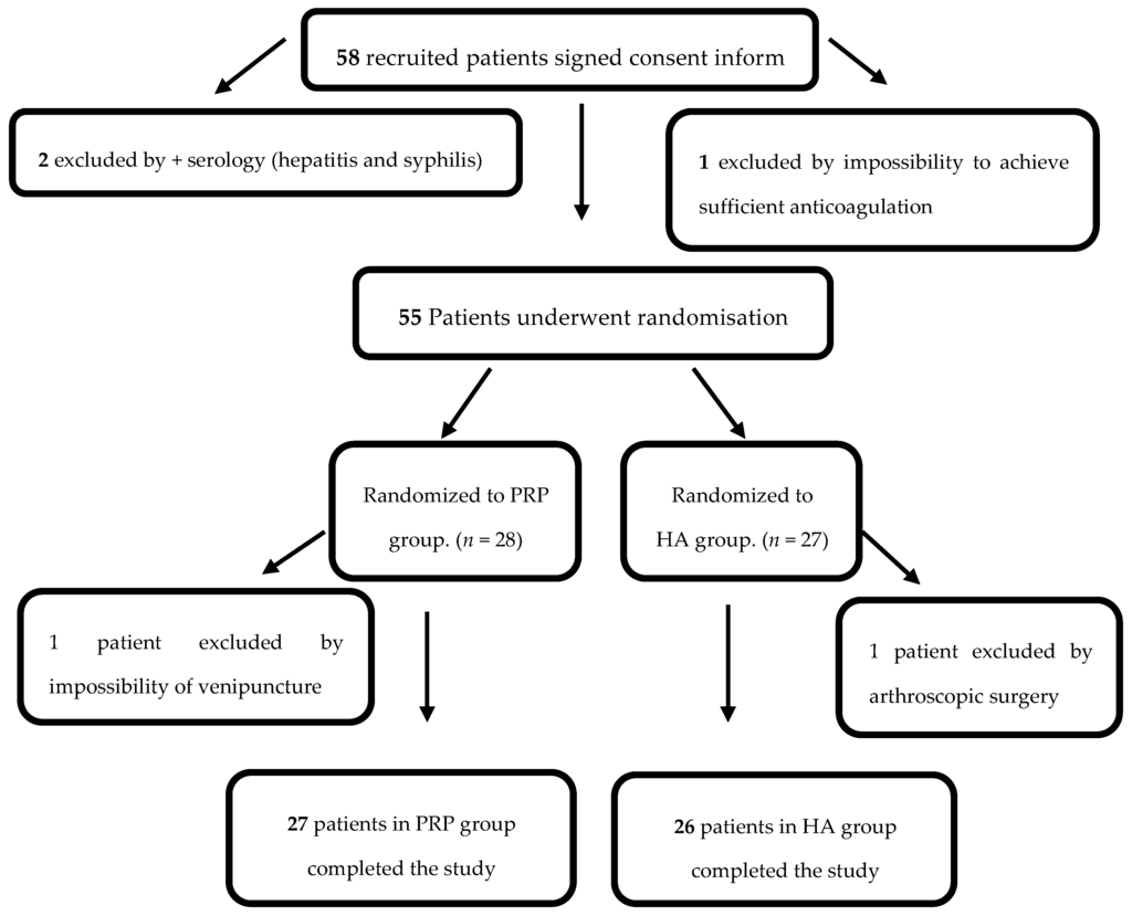 39]. Group I samples were used to isolate PRP while group II samples were used for a routine blood test. One patient belonging to the PRP group was rejected due to the impossibility of venipuncture. Once the study had begun, one case belonging to HA group was excluded, as she needed arthroscopic surgery due to meniscal tear. Therefore, the study concluded with 27 patients in group I (PRP) and 26 in group II (HA) (