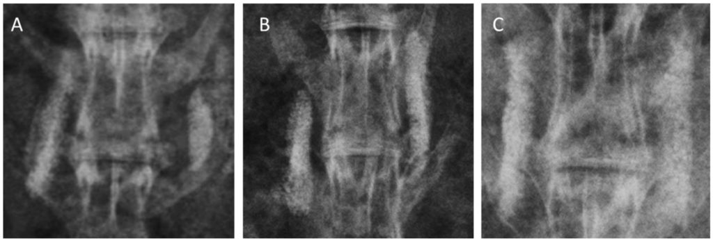 All animals were anesthetized and lumbar antero-posterior radiographs were taken at 4, 8, and 12 weeks. Each of these radiographs was taken under the same conditions (50 kv/160 mA/120 cm/10 mAs). After 12 weeks, all the rabbits underwent 2-mm thin-cut CT scans of the lumbosacral area. Three-dimensional models were created to visualize the fusion mass amid the inter-transverse process. The CT results were used to determine whether the inter-transverse area was fused or not. Two independent observers who were not involved in the index operation performed the radiographic assessment.
