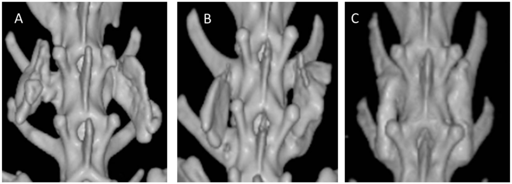 Computed tomography (CT) scans of 12-week specimens from each group. (A) collagen-β-TCP-HA; (B) collagen-β-TCP-HA/BMDMSCs; (C) collagen-β-TCP-HA/Baculo-BMP-7-BMDMSCs. The specimen from the collagen-β-TCP-HA/Baculo-BMP-7-BMDMSCs group had a stronger fusion mass between the inter-transverse process spaces.