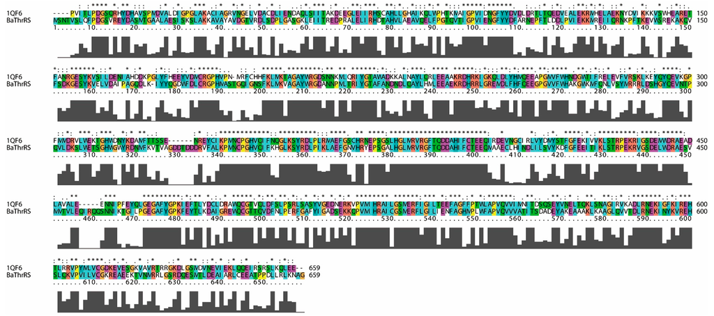 From the BLASTp matches of BaThrRS, we selected the structure of ThrRS from Escherichia coli (EThrRS) (PDB code 1QF6) [] as the modeling template. Above 50% identity, models tend to be reliable, with only minor errors in side chain packing and rotameric state []; these two proteins share 51% sequence identity, sufficient to construct a reliable model. Sequence alignment was performed using Clustal X 2.0 [] for homology modeling (Figure 1). The results revealed that the residues of the active site were conserved (EThrRS: Cys334, Arg363, Glu365, Met374, Arg375, Val376, Phe379, Gln381, His385, Gln479, Cys480, Thr482, His511, Gly516, Ser517, and Arg520; corresponding residues in BaThrRS: Cys343, Arg372, Glu374, Met383, Arg384, Val385, Phe388, Gln390, His394, Gln493, Cys494, Thr496, His525, Gly530, Ser531, and Arg534).