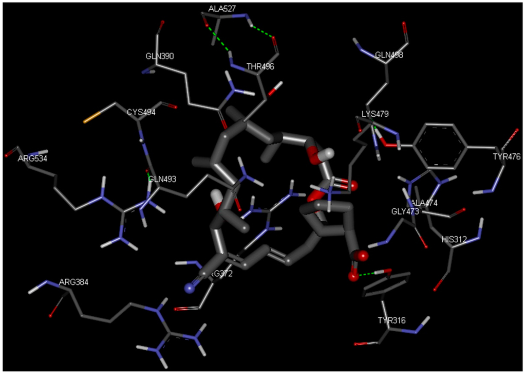To identify new and potent inhibitors against BaThrRS, we performed docking-based virtual screening on the active site of BaThrRS. The ZINC Natural Products Database (NPD) [], which includes 11,247 compounds, was used for virtual screening using AutoDock Vina. The screen yielded 99 candidate compounds whose scores were not greater than −11 kcal/mol. The top hits, with scores lower than −12 kcal/mol, are listed in Table 3. It is clear from these results that the screened compounds have stronger interactions and better docking scores than the selective inhibitor borrelidin (−9.7 kcal/mol). We docked the best inhibitor, ZINC27215482 (−12.6 kcal/mol) to BaThrRS and further analyzed its interactions with key amino acid residues. Figure 6 shows the binding mode of ZINC27215482 in BaThrRS. Gln493 forms two hydrogen bonds with the inhibitor, Tyr316 and Phe388 engage in π–π interactions, and Arg534 forms two cation–π interactions. Because cation–π interactions can also contribute significantly to intermolecular contacts and interactions with ligands, it has been proposed that they should be considered alongside more conventional hydrogen bonds, salt bridges, and hydrophobic effects in any analysis of protein structure []. As discussed before, the cation–π interaction stabilizes the inhibitor–enzyme complex. As shown in Figure 6, ZINC27215482 was surrounded by Tyr316, Asn319, Met341, Asn342, Cys343, Arg372, Glu374, Met383, Arg384, Val385, Phe388, Gln390, Asp392, His394, Tyr476, Lys479, Gln493, Thr496, Gln498, His525, Ser531, and Arg534. These results serve as a guide for identifying the key residues around the best inhibitor and the interactions between BaThrRS and the best inhibitor, which could be used to develop novel drugs against bovine brucellosis.