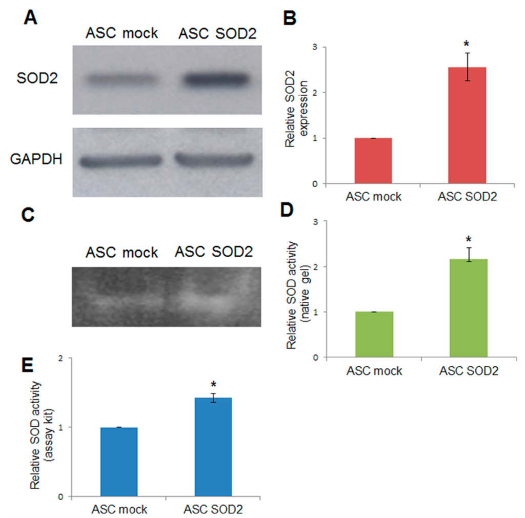 Adipose tissue-derived stromal and vascular cells were isolated from lipoaspirates obtained from human donors []. A lentiviral vector (LV) for expression of human superoxide dismutase 2 (SOD2) was generated and used for gene transfer into ASCs. Immunoblotting using anti-SOD2 antibodies followed by densitometric analysis revealed a 2.5-fold increased expression upon SOD2 gene transfer, compared to mock-transduced ASCs (Figure 1A,B). In addition, SOD activity was assayed by non-denaturing polyacrylamide gel electrophoresis followed by specific riboflavin-nitroblue tetrazolium staining and densitometric analysis (Figure 1C,D). Further determination of SOD activity after lentiviral-mediated SOD2 gene transfer into ASCs was obtained using a specific determination kit (Sigma-Aldrich, St. Louis, MO, USA) (Figure 1E). Both methods were in agreement in determining that enzymatic activity in SOD2 overexpressing cells was approximately 1.5–2.5 folds higher compared to mock-transduced cells.