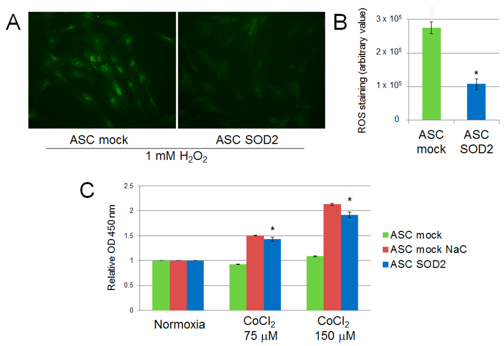 We evaluated the performance of mock- and SOD2-transduced human ASCs cultured in hypoxic condition in vitro. Firstly, we assessed the production of ROS following exposure of ASCs to 1 mM H2O2 for 30 min. SOD2-expressing cell culture displayed reduced ROS production following acute hypoxic stress, as determined by fluorescence microscopy with the ROS-sensitive CellROX oxidative stress reagent fluorogenic probe (Figure 2A). Additionally, ASCs were exposed to prolonged hypoxic conditions achieved by adding increasing concentration of CoCl2 to the culture medium. After 24 h cell viability was assessed by the WST-1 cell proliferation assay kit, reveling that SOD2 expressing ASC viability was increased compared to mock ASC (p ≤ 0.05) and comparable to the levels of ASC mock cells treated with the antioxidant N-acetylcysteine (NaC) (Figure 2B).