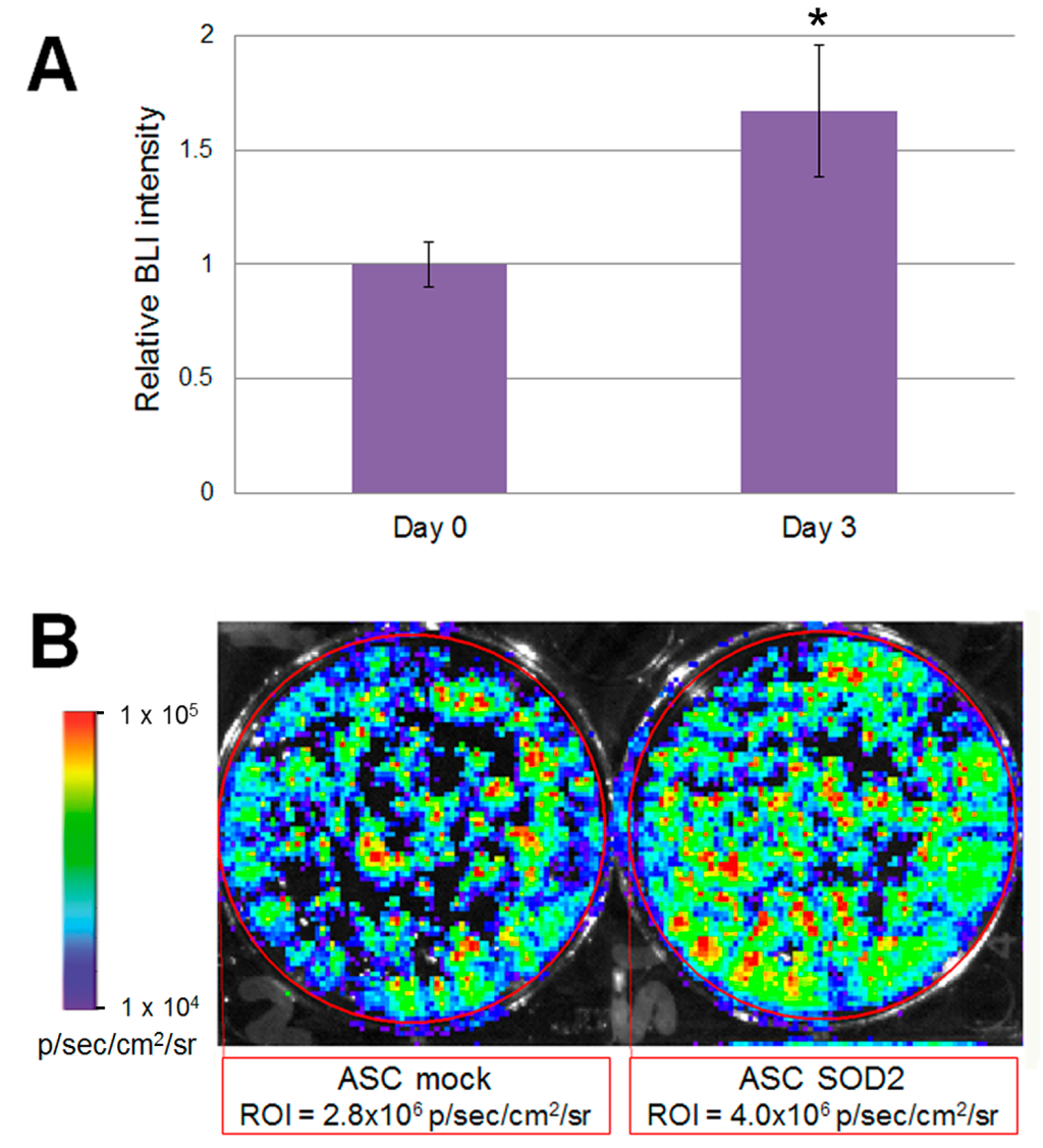 Luciferase positive SOD2-expressing ASCs display improved ability to withstand hypoxia in vitro. Murine ASCs expressing luciferase were transduced with LV vectors expressing either GFP as mock control or SOD2 and cultured in hypoxic conditions. (A) BLI analysis was performed at three days of culture and intensity of bioluminescence was determined. Data are expressed as the ratio of the BLI signal of the SOD2 group vs. mock control group. Data are expressed as mean ± SEM of three different independent experiments performed in duplicate. The asterisk indicates a significant difference determined by unpaired Mann–Whitney U test (p < 0.05); (B) A representative BLI analysis and quantification of ASCs cultured in hypoxic condition for three days.