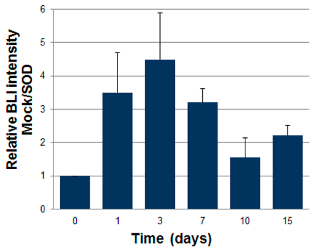 Accordingly, to validate our experimental design before studies involving animals, we wanted to test the performance of mock- and SOD2-transduced, luciferase expressing murine ASCs cultured in hypoxic condition in vitro. To mimic the hypoxic environment which cell face upon transplantation, we cultured luciferase-expressing ASCs in a modular airtight humidified chamber flushed with a gas mixture which consisted of 95% N2 and 5% CO2 for three days. Bioluminescent imaging (BLI) analysis was performed before hypoxia induction and after three days of culture in hypoxic condition (Figure 3). At the 72 h time point, BLI imaging signal detected in SOD2-overexpressing cells was statistically significantly higher than the one observed in mock transduced cells (Figure 3B). In the current experimental setting, stronger bioluminescence signal correlates with improved survival of SOD2-expressing cells, compared to mock (GFP)-transduced control. BLI analysis performed on cells undergoing the same gene transfer procedure, but maintained in normoxic condition did not reveal any significant difference amongst the groups.
