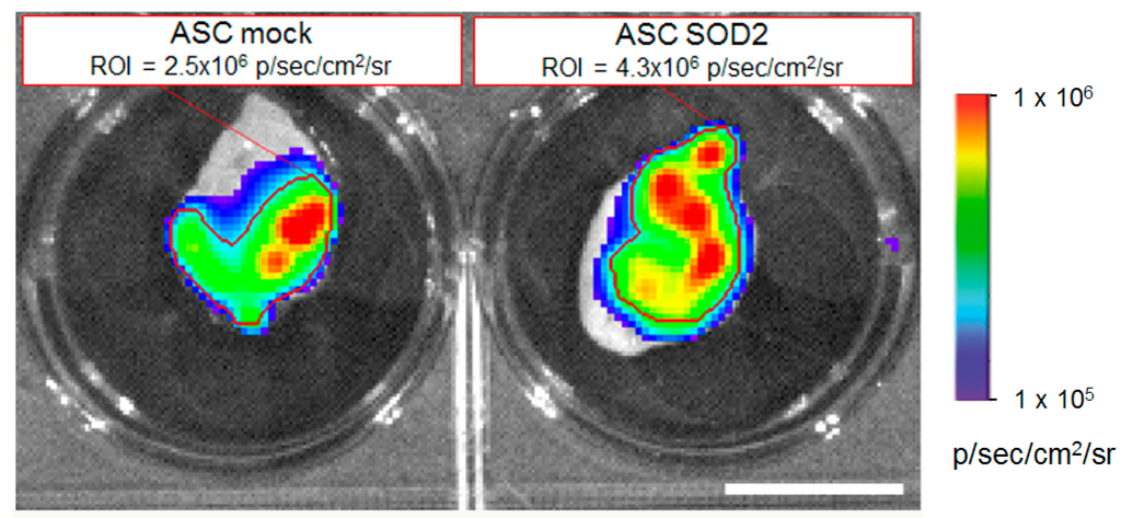SOD2-expressing ASCs show improved engraftment potential: ex vivo gel plug BLI analysis. Analysis of gel plugs excised at necropsy from one representative animal per group three days after implantation of Cultrex containing 7 × 105 luciferase-positive ASCs expressing either GFP (mock control) or SOD2. Quantification of the BLI signals in the respective selected regions of interest (indicated by the red lines) confirmed improved engraftment of SOD2-expressing cells compared to mock control. Scale bar: 1 cm.
