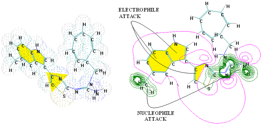 The electronic basins (left) and the associated electrostatic potential contours (right) for 4-(5-methylindolyl)-2-methylheptylguanidinothiazole, displaying optimized maximum electrophilic activity by the predicted special computing trace of the algebraic structure-activity relationship (SPECTRAL-SAR) mechanism action [56]. Green lines correspond with highest occupied molecular orbitals (HOMO), magenta with lowest unoccupied molecular orbitals (LUMO) with the yellow shapes marked as key fragments for chemical frontier reactivity.