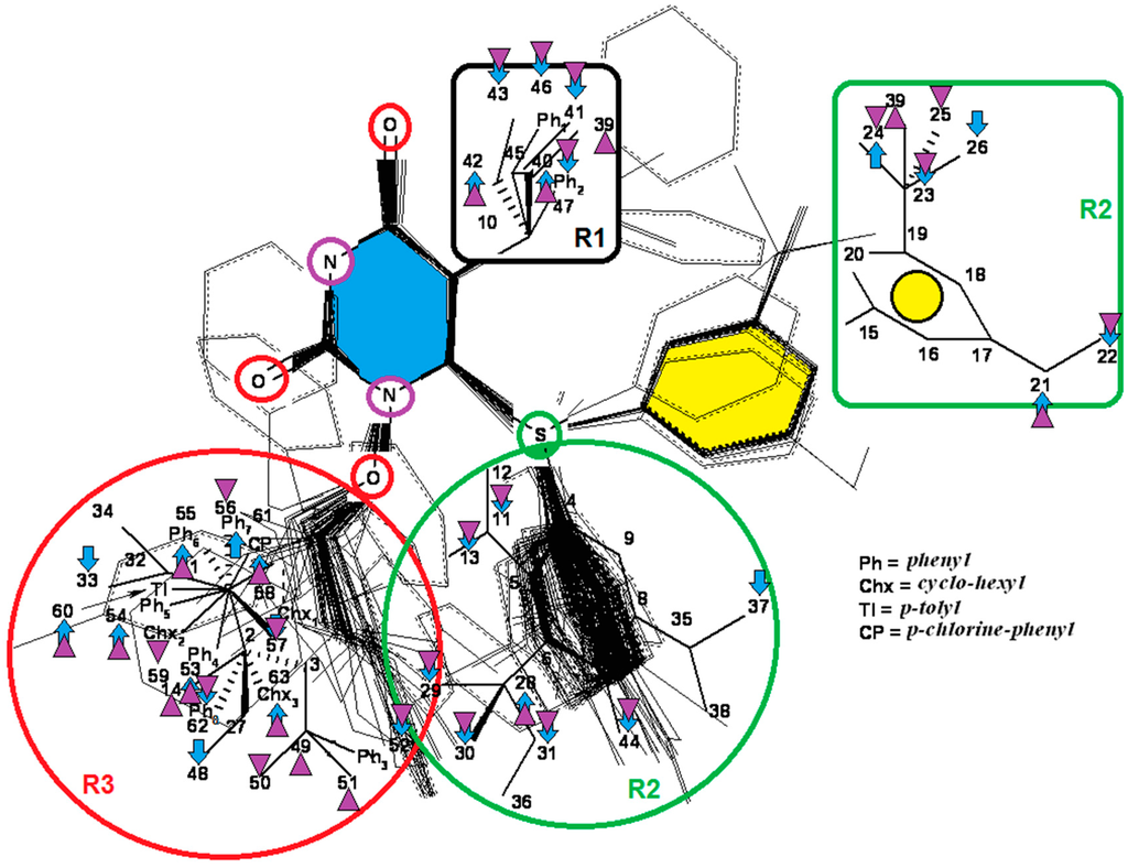 1-[(2-hydroxyethoxy)-methyl]-6-(phenylthio)thymine (HEPT) structure with superimposition of 79 derivatives with minimum energy conformations; these are (marked in blue, in the center) the possible positions for substituents of the uracil ring; also in blue, we marked the 63 obtained vertices [19]; down arrows and triangles denote those beneficial vertices (attributed to the receptor cavity), up arrows and triangles indicate the detrimental vertices, for the mono-linear and bi-linear MTD analysis of Equations (17) and (19) and the optimized charts (18) and (20), respectively; see the text for further details. Circular colors generally indicate self-corresponding visualization for the molecular group belonging in the hypermolecule.