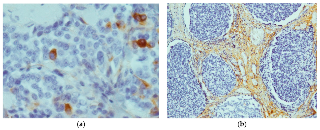 Staining results of tenascin C: (a) 40× magnification, showing cytoplasmic staining; (b) 10× magnification, depicting staining of the extracellular matrix and the lymph follicle-like accumulation of tumor cells.