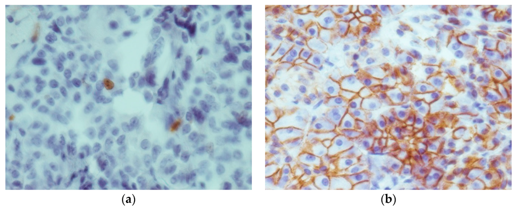(a) 40× magnification, depicting the staining results of Ki-67 (note the proliferating cell in the center); (b) 40× magnification, showing strong plasma-membrane expression of E-cadherin.