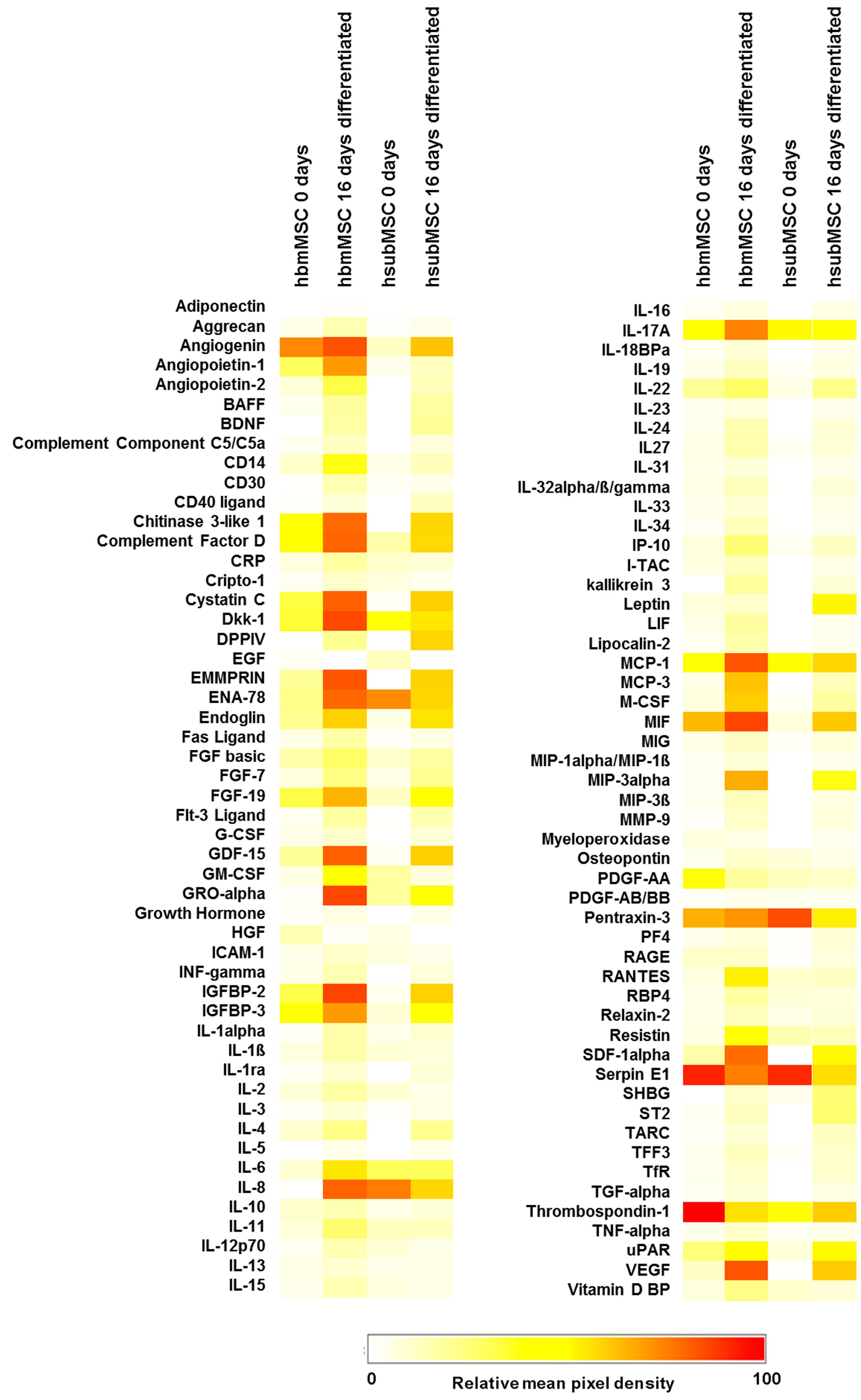 Heatmap of secretory protein abundance of undifferentiated (0 day) and differentiated (16 day) hbmMSC and hsubMSC. The heatmap was created by setting the maximal pixel intensity of the reference spots on the array arbitrarily to 100 (red colour), to which the abundance of all other analytes is relative. Minimal abundance (0) is encoded by white, mean abundance (50) by yellow colouring. Pixel densities shown were calculated as means from three independent experiments with MSC from different donors each.