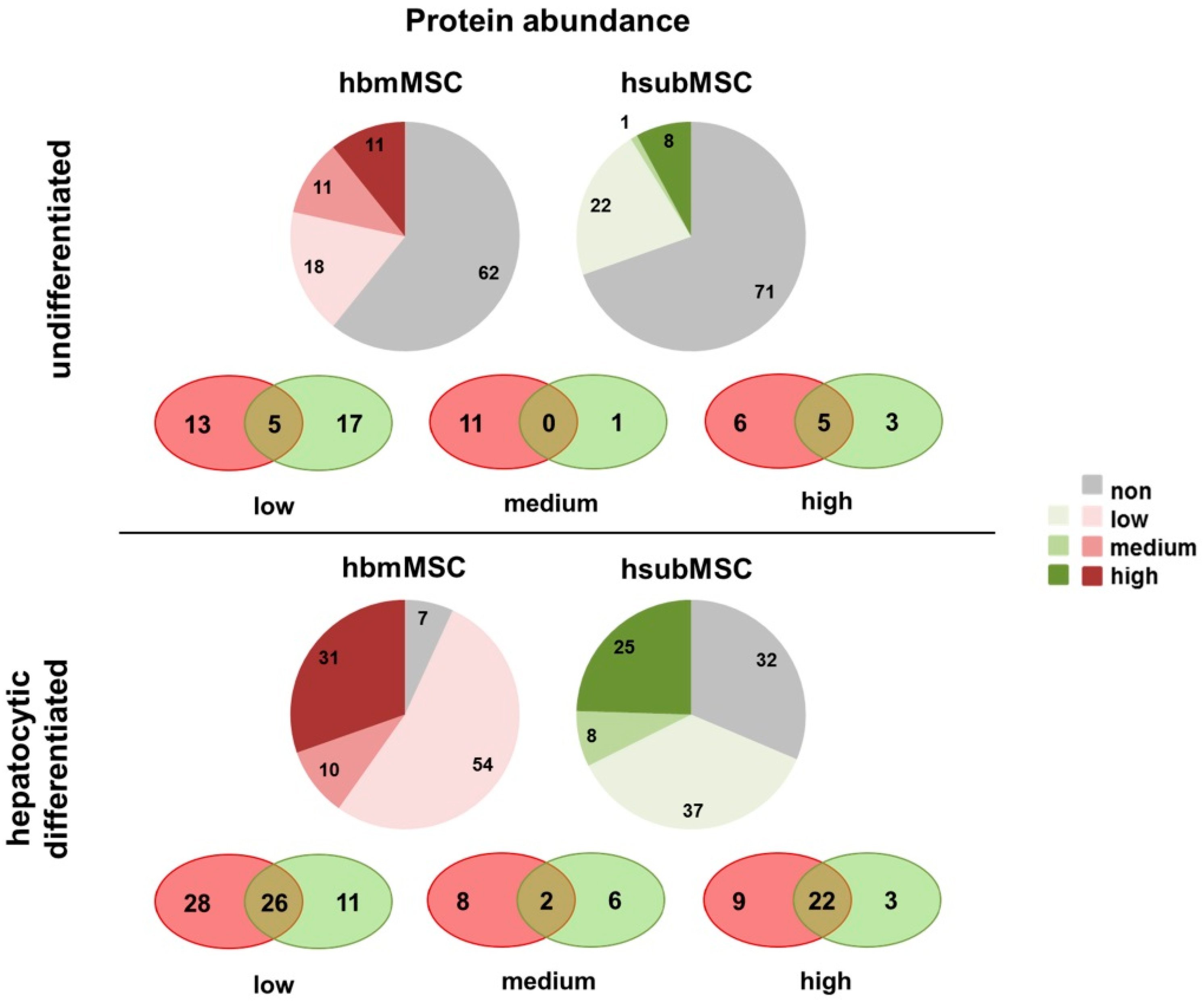 Graphical illustration of proteins secreted by undifferentiated (top) and differentiated (bottom) hbmMSC (red) and hsubMSC (green). The pie charts represent the number of proteins arbitrarily classified as low, medium and high secretion. The number of proteins not detected is shown in grey. Proteins secreted both by hbmMSC and hsubMSC are shown as the intersection of proteins secreted at low, medium and high abundance. Estimates were deduced from three independent experiments using MSC from three different donors each.