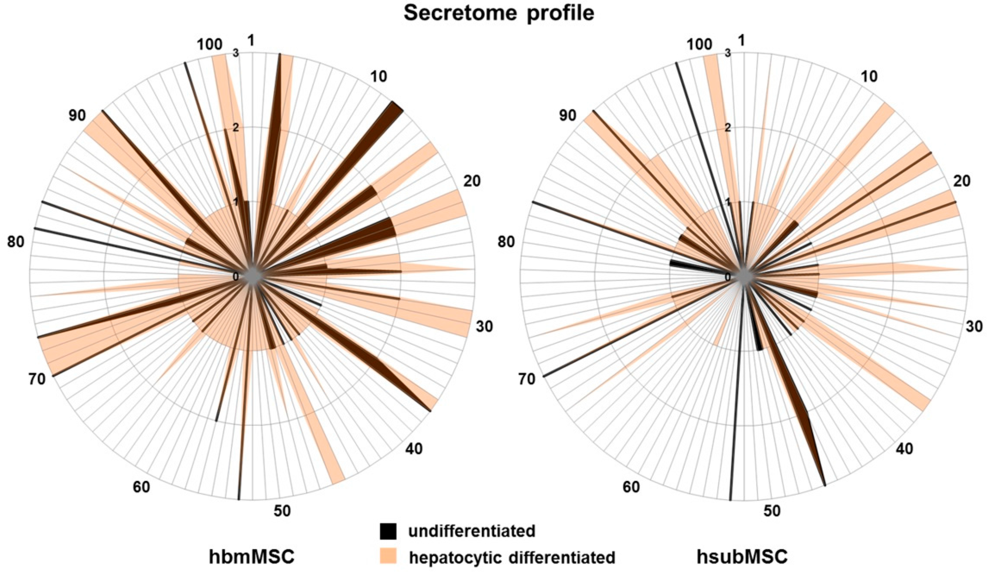 Graphical nets of proteins secreted by undifferentiated (black lines) and differentiated (orange lines) hbmMSC (left) and hsubMSC (right) in low (1), medium (2) and high (3) abundance as taken from results shown in Figure 3. Individual proteins are numbered consecutively from 1 to 102 as shown at the edge of the radii. A comprehensive list of numbers and corresponding proteins is given in Table S5.
