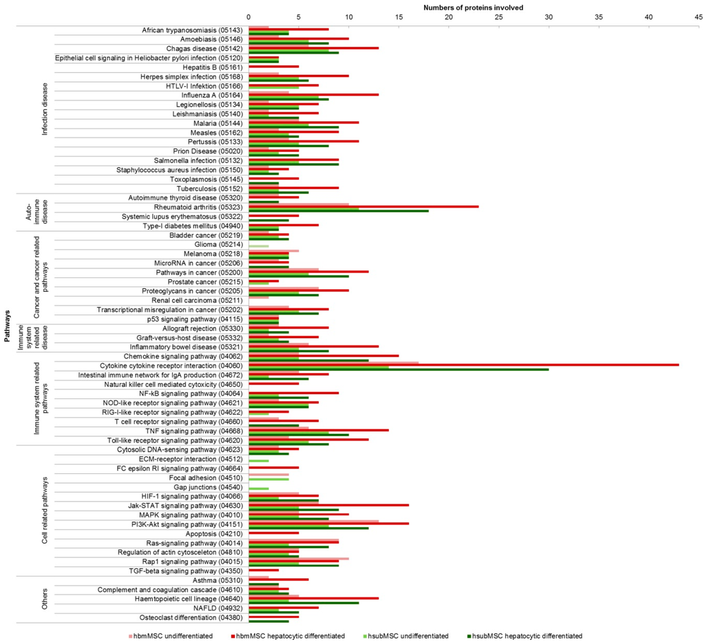 Data taken from Figure 4 were subjected to analyses identifying pathways, which might be targets of the proteins secreted by hsubMSC and hbmMSC before and after hepatocytic differentiation. Pathways affected comprised immune disease and cancer-related pathways as well as pathways involved in cellular processes. As expected, pathways involved were mainly identical for both hsubMSC and hbmMSC. Generally, the number of proteins engaged in the pathways increased after hepatocytic differentiation, corroborating that undifferentiated MSC were equipped with a basic profile of secretory proteins, tackling each single pathway, up-regulated by hepatocytic differentiation (Figure 5).